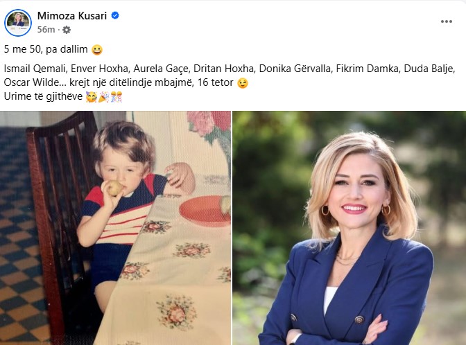 “5 me 50, pa dallim. Ismail Qemali, Enver Hoxha, Aurela Gaçe, Dritan Hoxha, Donika Gërvalla, Fikrim Damka, Duda Balje, Oscar Wilde… krejt një ditëlindje mbajmë, 16 tetor. Urime të gjithëve”, ka shkruar Kusari-Lila.