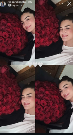 Me një buqetë me lule të kuqe ajo ndau disa fotografi ku shihet shumë e gëzuar.
