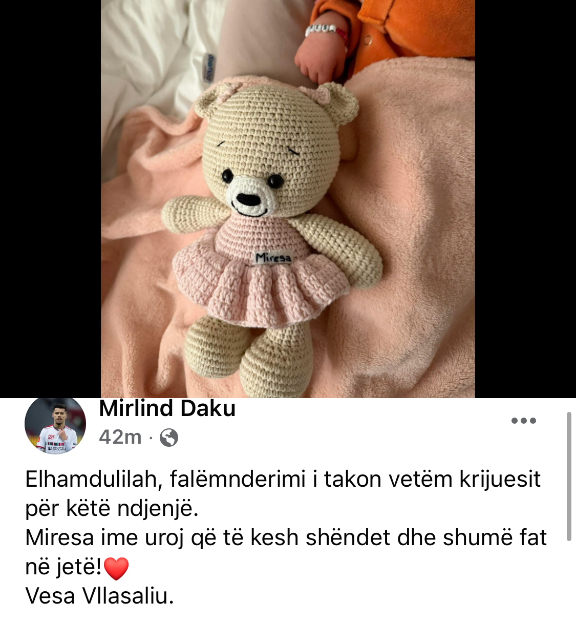 “Elhamdulilah, falënderimi i takon vetëm krijuesit për këtë ndjenjë. Miresa ime uroj që të kesh shëndet dhe shumë fat në jetë!” – ka shkruar Daku në postimin e tij, duke etiketuar edhe Vesën.