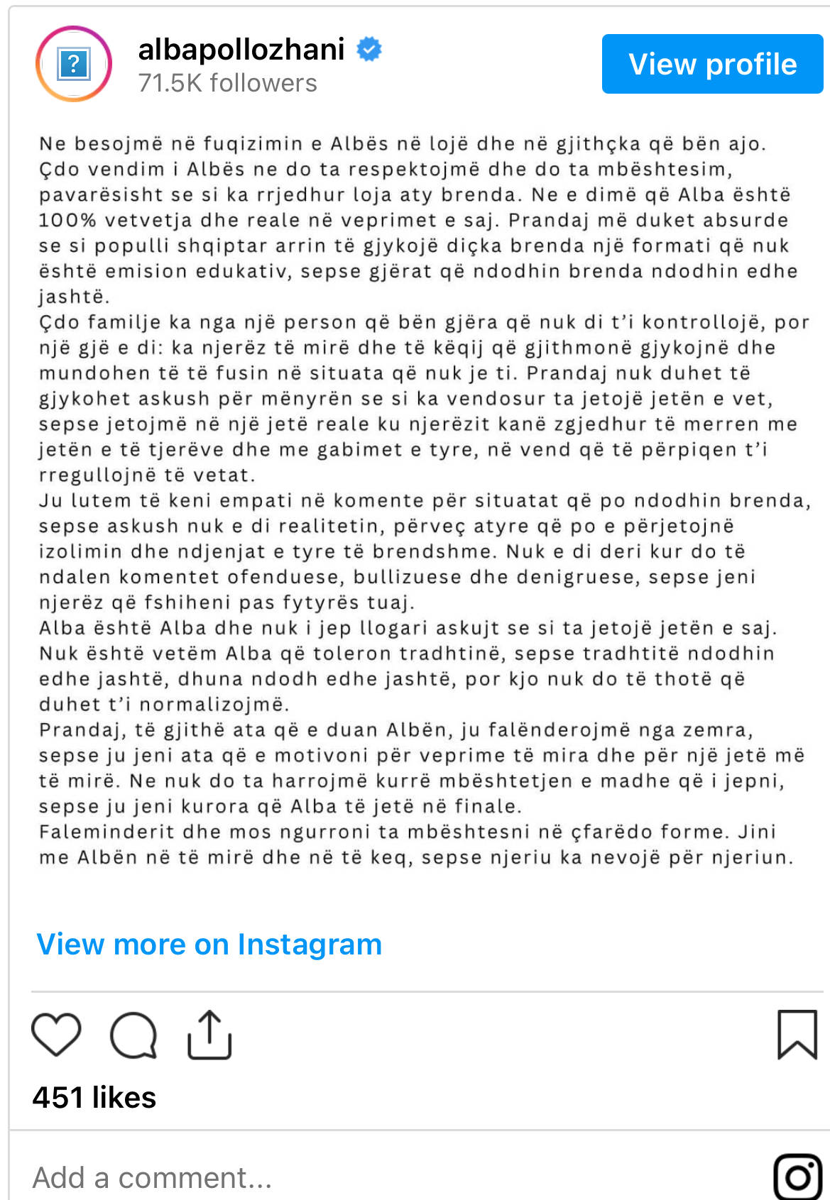 Familja e Albës ka reaguar përmes një postimi në Instagram, në një deklaratë të gjatë, lidhur me situatat e ndodhura brenda formatit ku ajo po merr pjesë si dhe me komentet dhe gjykimet e shumta të publikut.