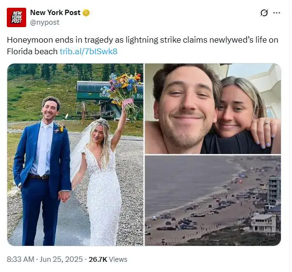 Muaji i mjaltit i një burri 29-vjeçar nga Kolorado përfundoi tragjikisht kur u godit nga rrufeja ndërsa ndodhej në plazhin New Smyrna në Florida.