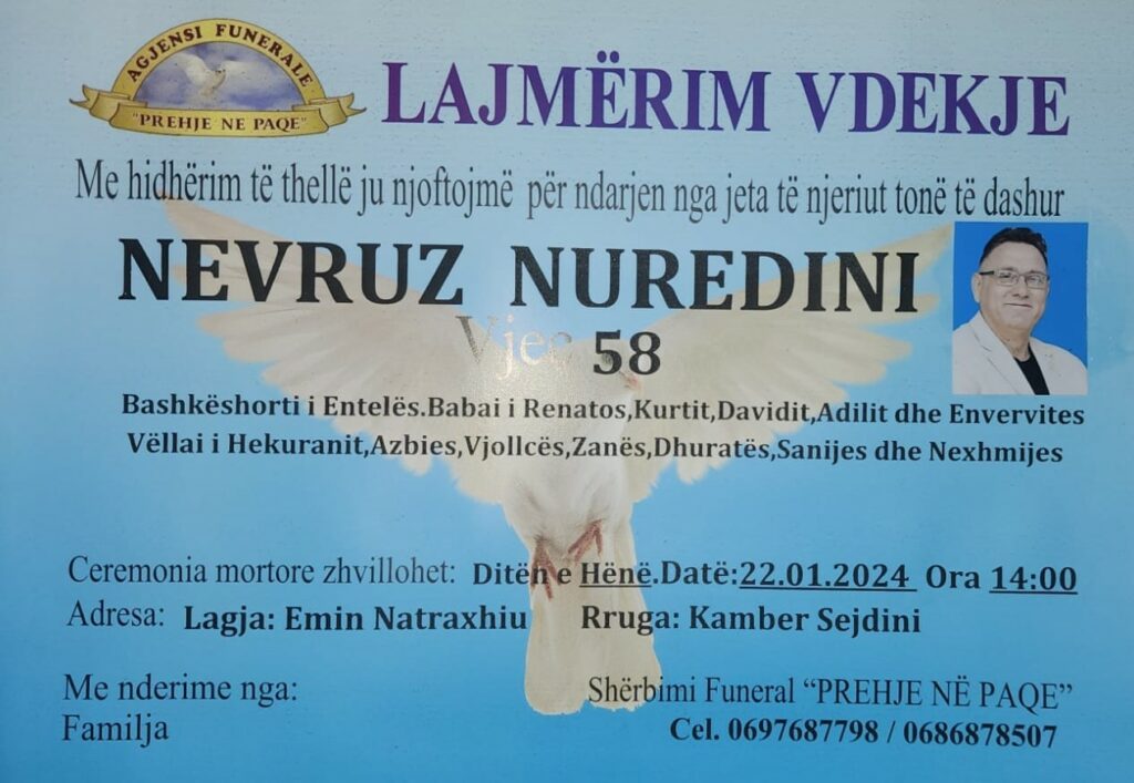 Nevruz Nuredini u përcoll për në banesën e fundit këtë të hënë. Nevruz Nuredini ka lënë një pasuri të madhe artistike, duke njohur sukses me disa hite në skenën e muzikës së Shqipërisë së Mesme.