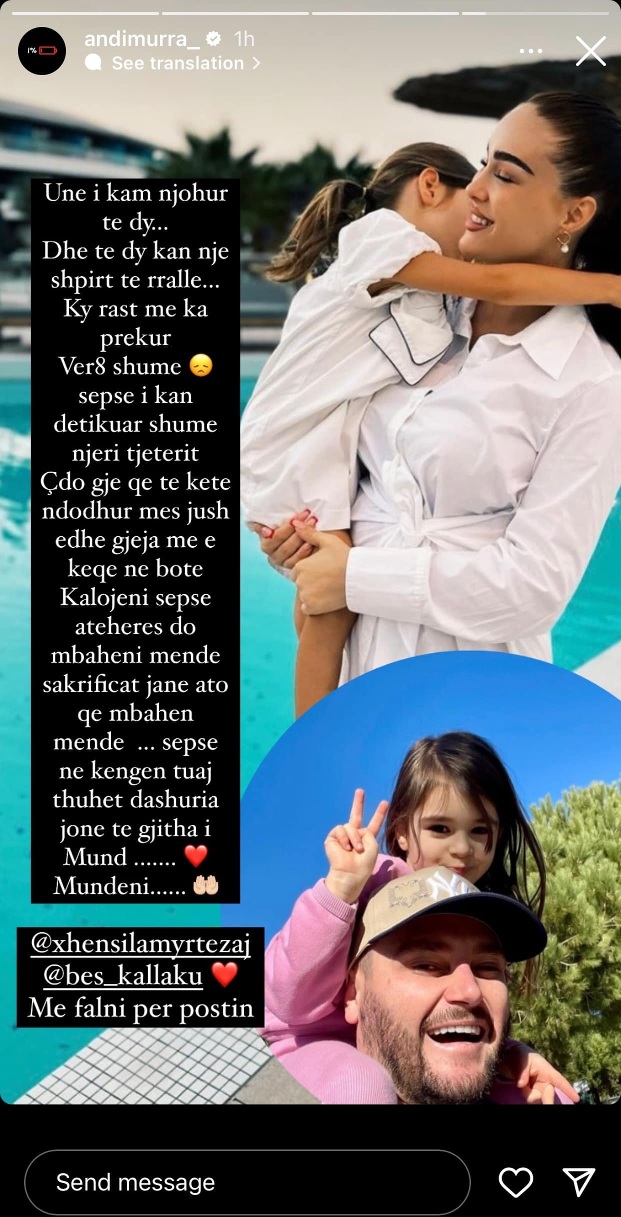 “Unë i kam njohur të dy, dhe të dy kanë një shpirt të rrallë. Ky rast më ka prekur vërtet shumë sepse i kanë dedikuar shumë njëri tjetrit. Çdo gjë që të ketë ndodhur mes jush edhe gjëja më e keqe në botë kalojenk sepse atëherë do mbaheni mend, sakrificat janë ato që mbahen mend, sepse në këngën tuaj thujet ‘Dashuria jonë të gjitha i mund’, Mundeni…Më falni për postin”- shkroi ai tek ka bërë tag çiftin.