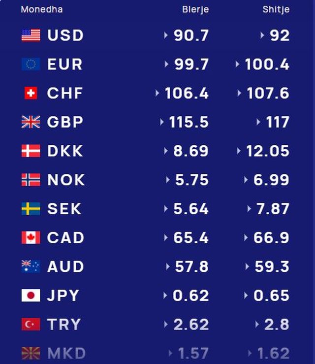 Dollari amerikan blihet me 90.7 lekë dhe shitet me 92 lekë, ndërsa paundi britanik këmbehet me 115.5 lekë në blerje dhe 117 lekë në shitje. Euro, nga ana tjetër, bleret me 99.7 lekë dhe shitet me 100.4 lekë.