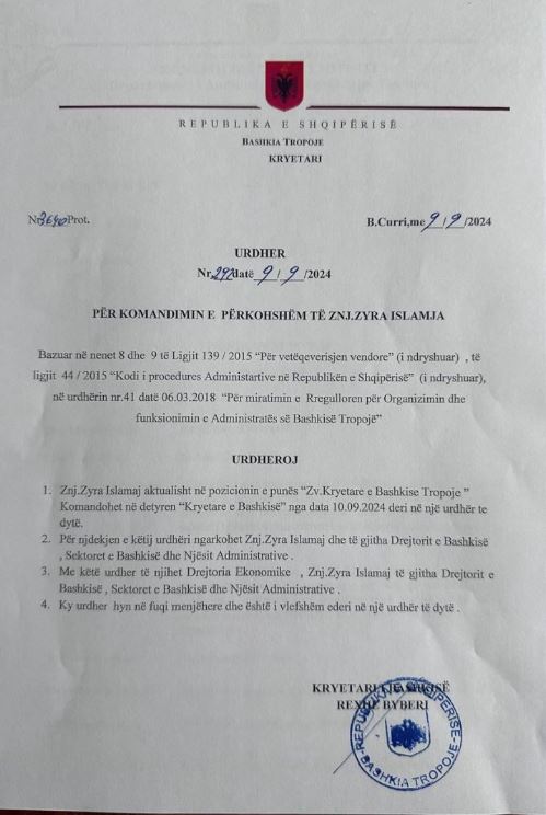 “Pasi ju komunikua masa e sigurisë ‘arrest shtëpie’, Z. Byberi duke uzurpuar kompetencat e Këshillit Bashkiak si i vetmi organ i cili kryen komandimet në detyrë në rast vakance të kryetarit, z. Byberi komandoi në detyrën e kryetarit të Bashkisë Tropojë, zëvendëskryetaren, znj. Zyra Islamaj.