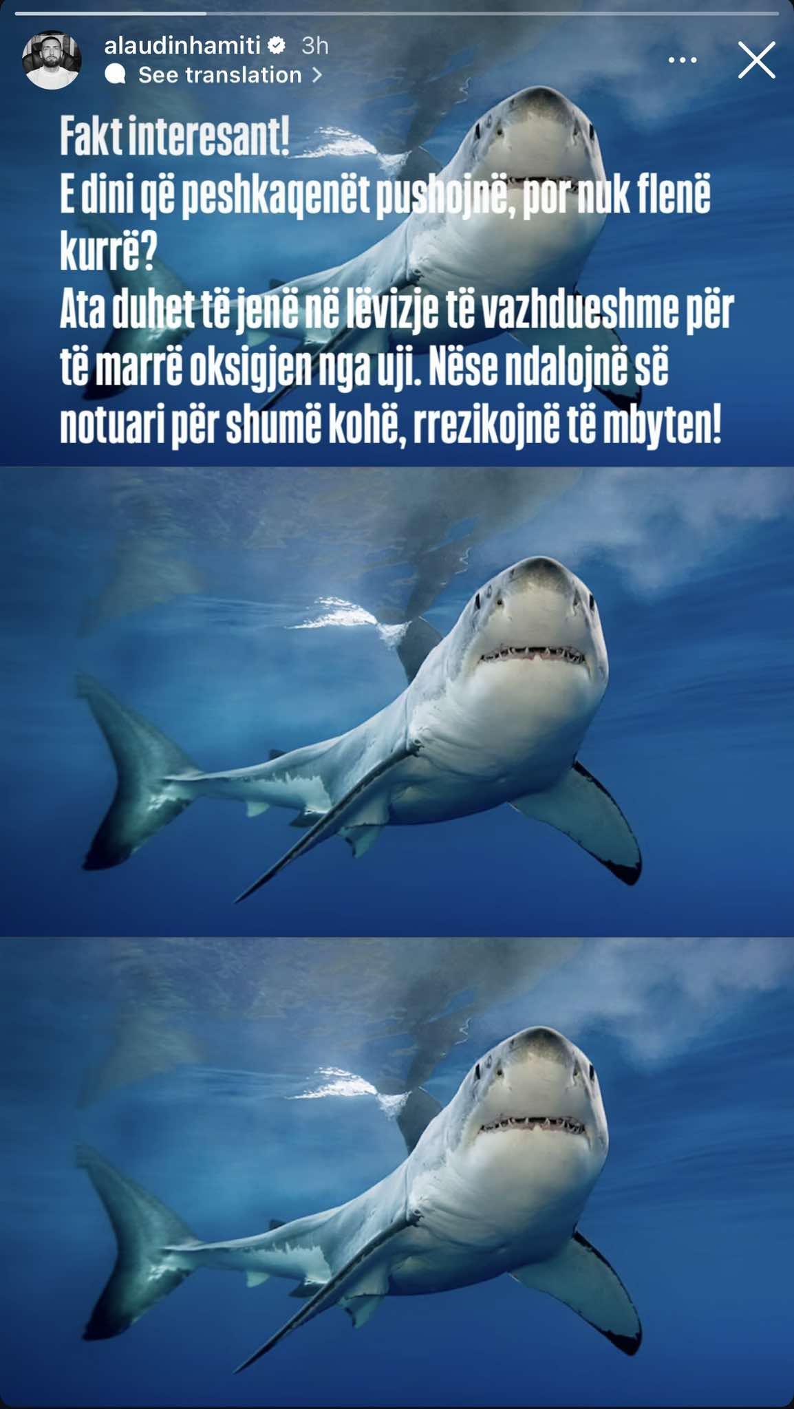 Në pritje të nisjes së programit, ai ka ndarë një postim interesant në rrjete sociale që lidhet me peshkaqenët.