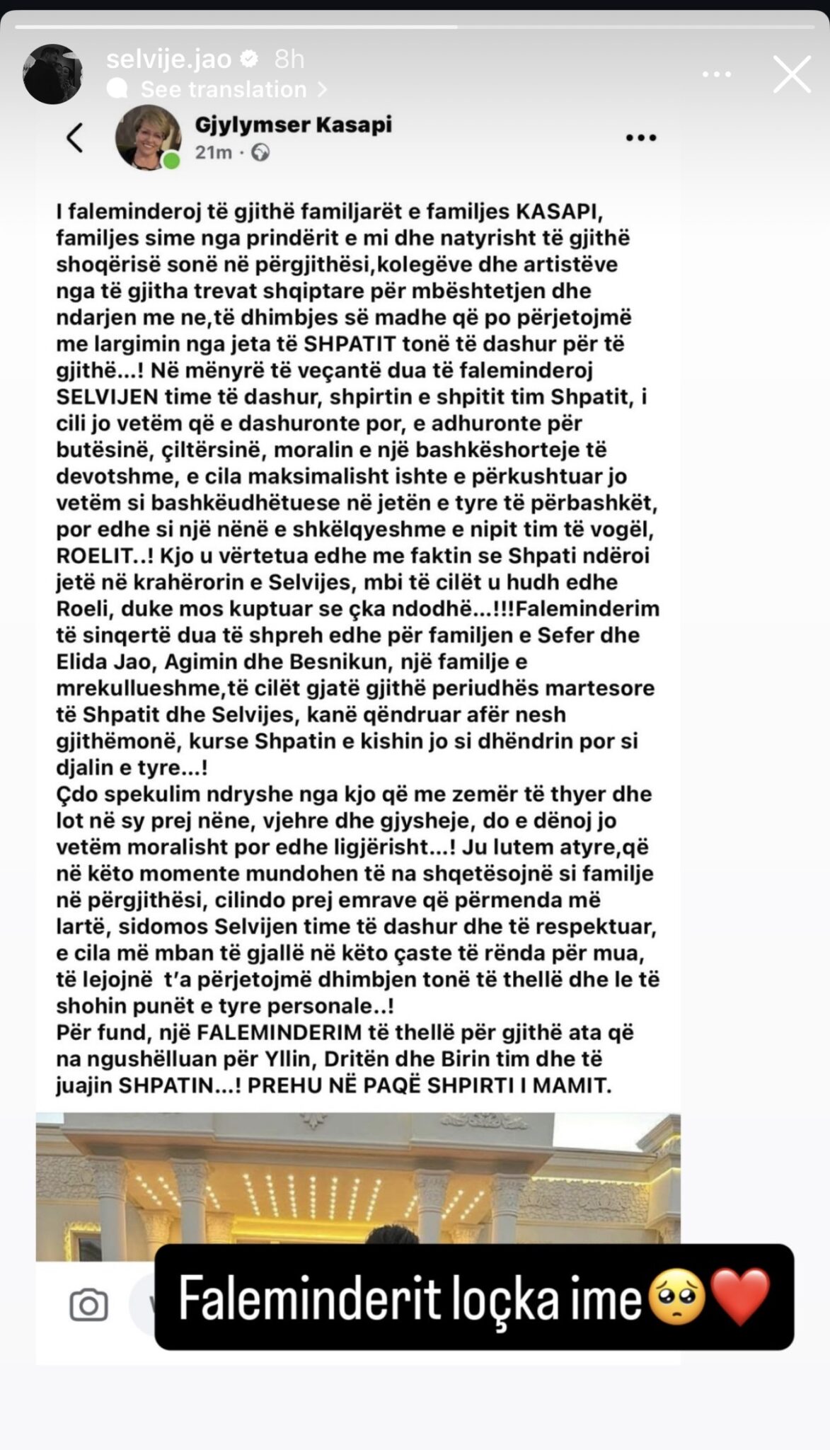 Shpati ndërroi jetë në krahërorin e Selvijes,” shkruan ajo, duke zbuluar edhe detajin më të dhimbshëm për djalin e tyre të vogël, Roelin. “Mbi të cilët u hodh edhe Roeli, duke mos kuptuar se çka ndodhë…”