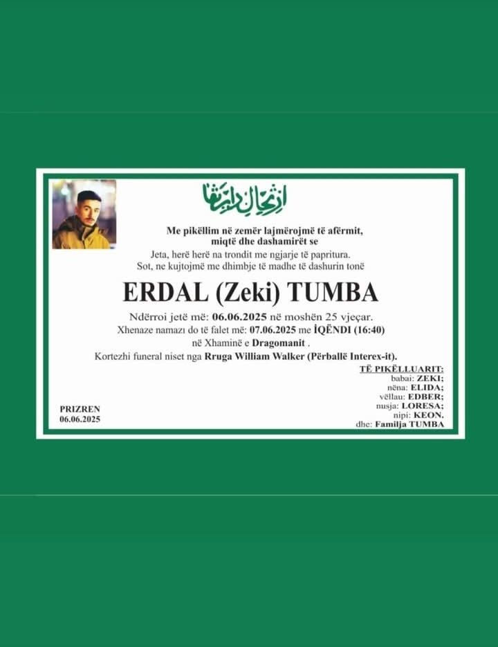 Nesër, më 7 qershor, në orën 16:40, do t’i jepet lamtumira e fundit 25-vjeçarit Erdal Tumba, i cili ndërroi jetë pas plagëve të marra në një aksident trafiku më 18 maj në fshatin Pouskë, raporton Gazeta Sinjali.