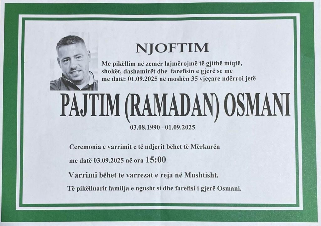 Rreth orës 14:30, më 1 shtator, në Emergjencën e Suharekës është sjellë pa shenja jete Pajtim Osmani, 35-vjeçar, i cili kishte pësuar lëndime të rënda në kokë derisa po punonte me një vinç ngarkues në rrugën Dubravë–Mushtishtë.