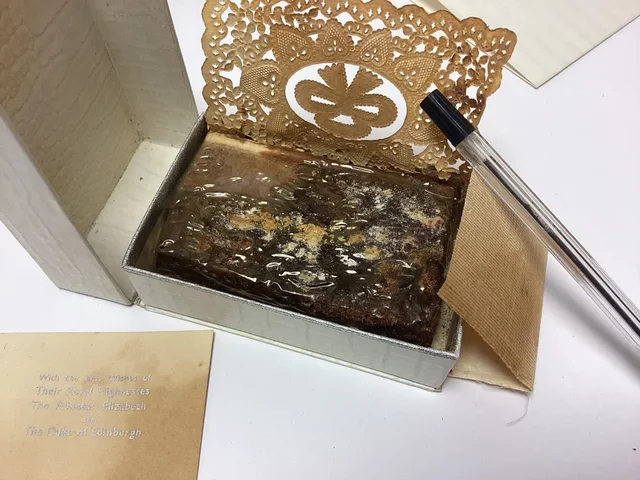 Torta, e cila nuk duket më e ngrënshme, mbijetoi për gati tetë dekada që nga dita e dasmës më 20 nëntor 1947.