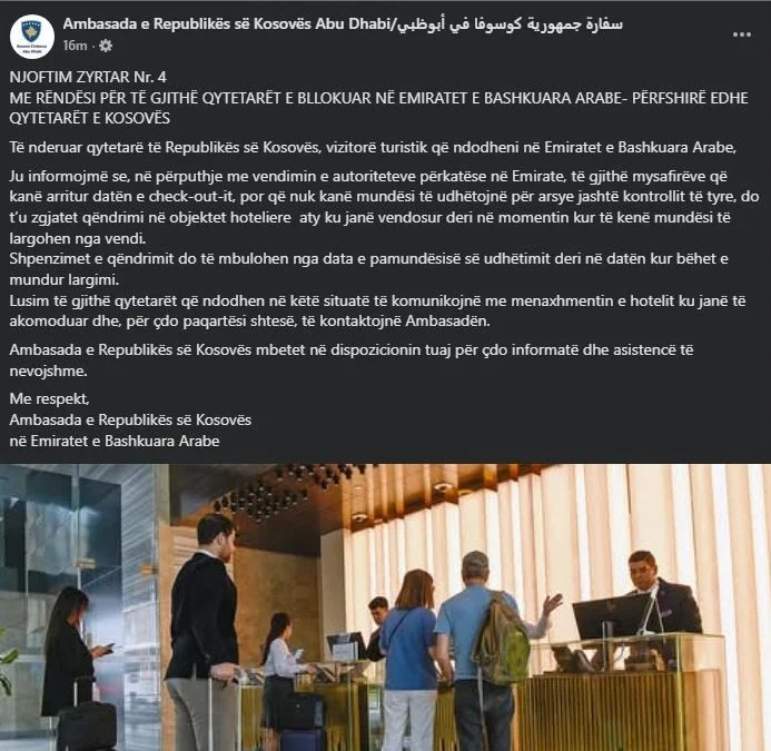Ambasada e Republikës së Kosovës në Emiratet e Bashkuara Arabe ka njoftuar të gjithë qytetarët e Kosovës dhe vizitorët turistikë që ndodhen atje, se autoritetet përkatëse në Emirate kanë vendosur zgjatjen e qëndrimit në objektet hoteliere për ata që kanë arritur datën e check-out-it, por nuk kanë mundësi të udhëtojnë për arsye jashtë kontrollit të tyre.