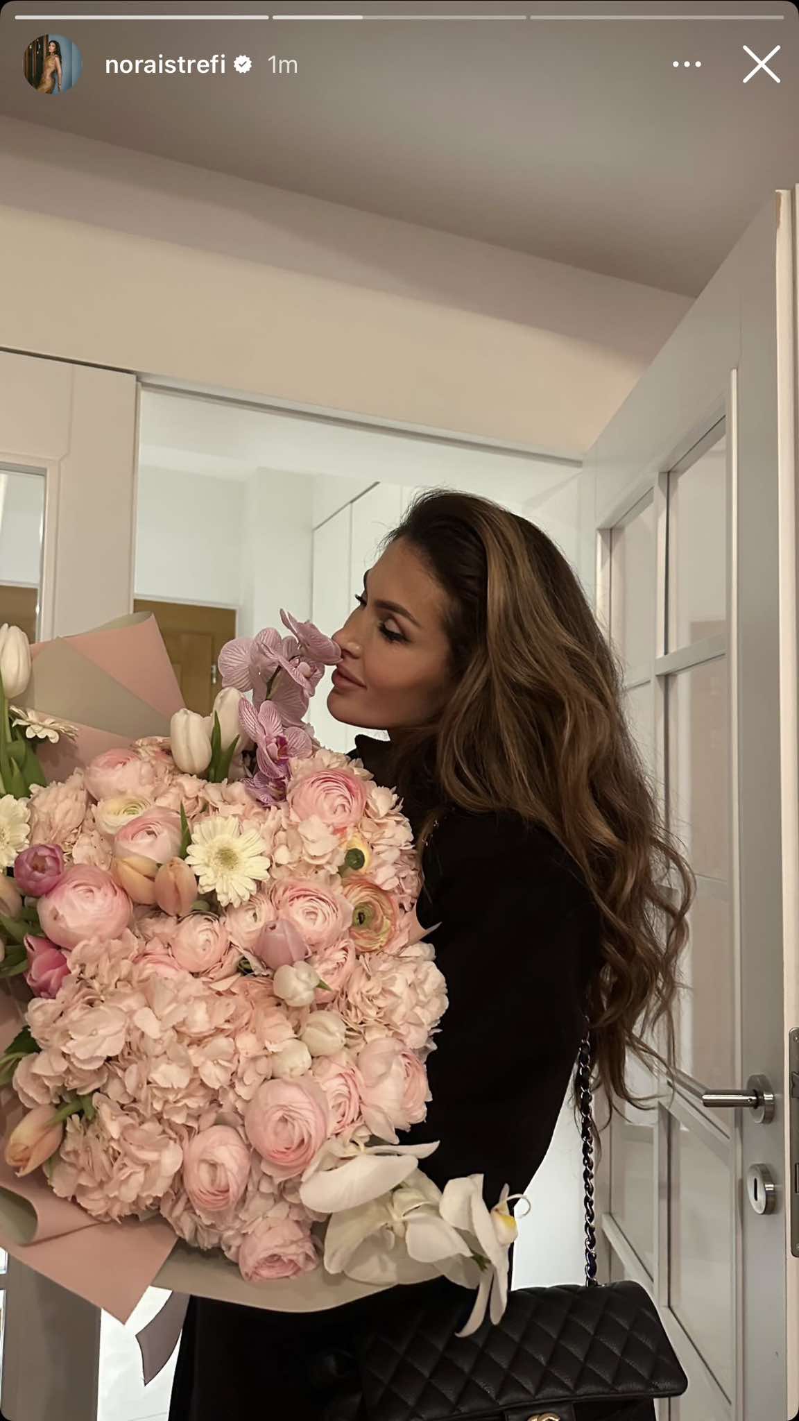 Sot, Nora ka pranuar një buqetë të madhe me trëndafila të bardhë.