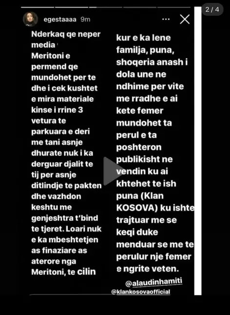Ditën e sotme ka qarkulluar një deklaratë nga ish-partnerja e tij, që është dhe mamaja e djalit, një rrëfim i gjatë në Instastory ku thekson se Meritoni nuk i ka dhënë djalit as mbështetje monetare e as atërore pasi sipas saj, nuk janë takuar kurrë.