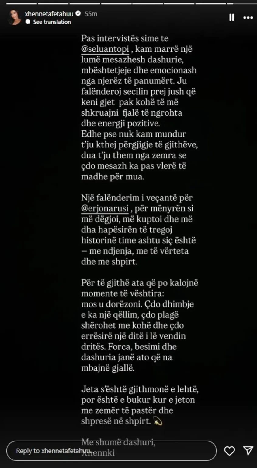Pas intervistës sime te @seluantopi, kam marrë një lumë mesazhesh dashurie, mbështetjeje dhe emocionesh nga njerëz të panumërt. Ju falënderoj secilin prej jush që keni gjet pak kohë të më shkruani fjalë të ngrohta dhe energji pozitive.