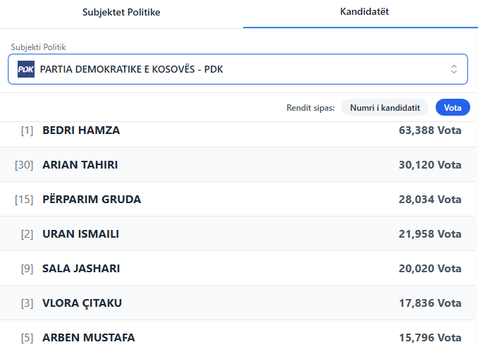 Në PDK pesë të parët janë Bedri Hamza, Arian Tahiri, Përparim Gruda, Uran Ismaili e Vlora Çitaku.