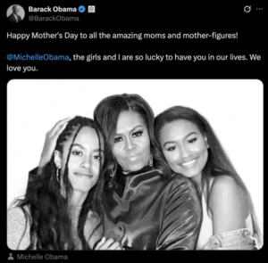 “Gëzuar Ditën e Nënës për të gjitha nënat dhe figurat amësore të jashtëzakonshme”, shkroi ai në platformën X, duke e shoqëruar mesazhin me një foto familjare të Michelle me vajzat e tyre, Malian dhe Sashan. “Michelle Obama, unë dhe vajzat jemi me shumë fat që të kemi në jetën tonë. Të duam”, përfundon postimi.