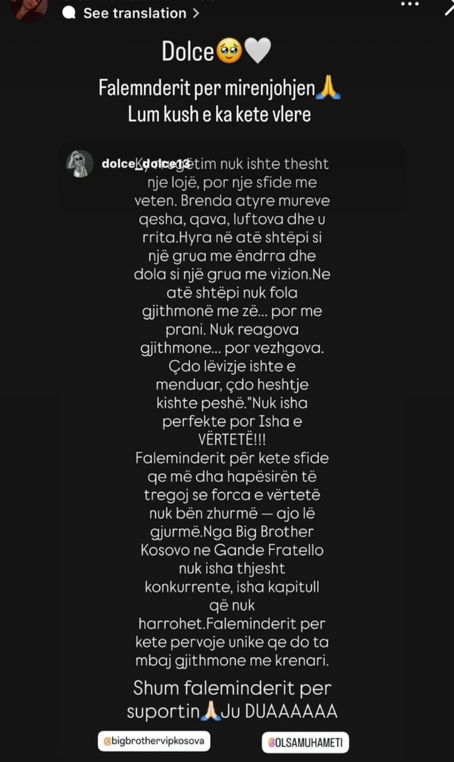 Në story-n e saj, Dolce falenderon produksionin dhe Olsën “për përvojën unike që do ta mbajë gjithmonë me krenari” dhe publikun për mbështetjen që i ka treguar.