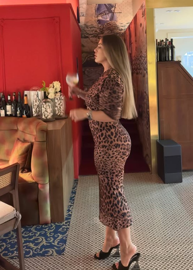 Në fotografinë e publikuar, ajo shihet duke shijuar një pije në një ambient të sofistikuar, me një sfond artistik që përforcon ndjesinë e një atmosfere luksoze dhe të kuruar deri në detaje.
