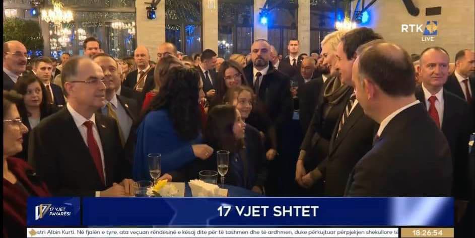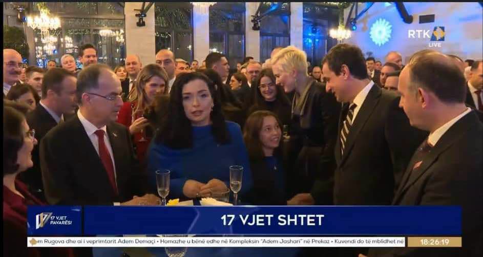 Në një tavolinë të përbashkët po qëndrojnë presidentja Osmani e kryeministri Kurti me rastin e pritjes shtetërore për 17-vjetorin e Pavarësisë së Kosovës.