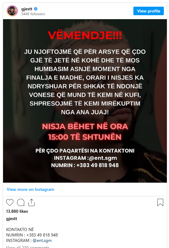 Me rastin e finales së madhe të “BBVA4” të afërmit e Gjestit që menaxhojnë llogarinë e tij në Instagram kanë dalë me një njoftim të rëndësishëm për të gjithë fansat.
