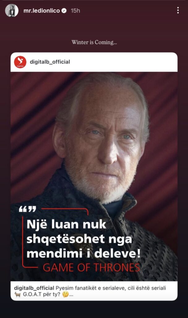 Për t’i dhënë fund aludimeve, Ledioni ka postuar në InstaStory thënien e njohur nga “Game of Thrones”: “Një luan nuk shqetësohet nga mendimi i deleve!” Ai e shoqëroi këtë citim me frazën: “Winter is Coming…” (Dimri po vjen…), e cila u interpretua edhe si paralajmërim për nisjen e edicionit të pestë të formatit.