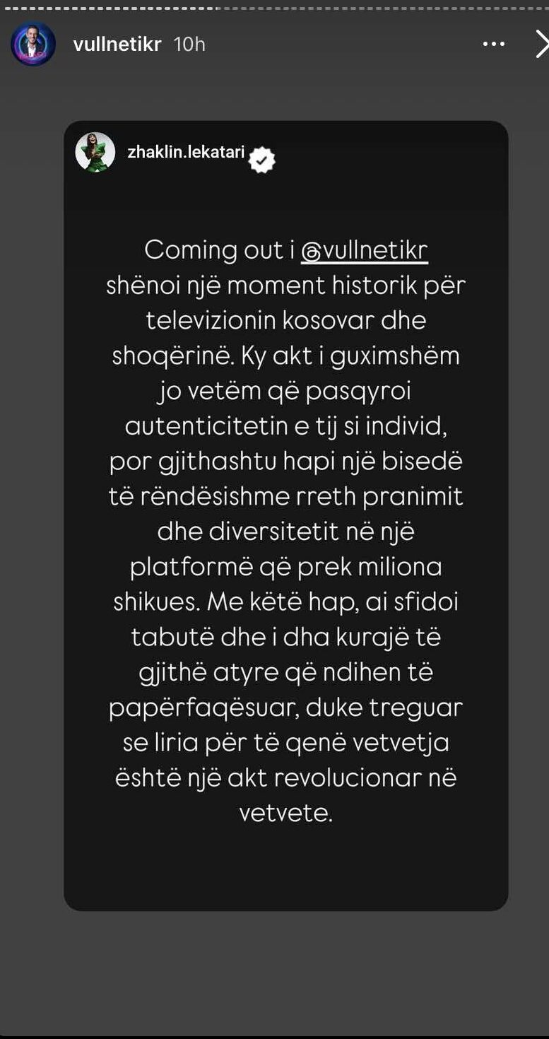 “Vullneti shënoi një moment historik për televizionin kosovar dhe shoqërinë. Ky akt i guximshëm jo vetëm që pasqyroi autenticitetin e tij si individ, por gjithashtu hapi një bisedë të rëndësishme rreth pranimit dhe diversitetit në një platformë që prek miliona shikues. Me këtë hap, ai sfidoi tabutë dhe i dha kurajë të gjithë atyre që ndihen të papërfaqësuar, duke treguar se liria për të qenë vetvetja është një akt revolucionar në vetvete” ishin fjalët e Lekatarit.