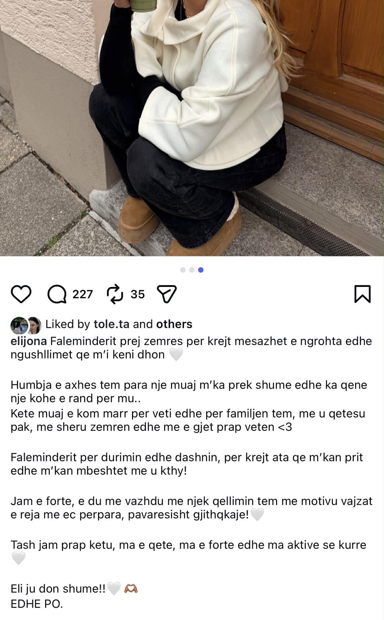 Në fjalët e ndjera, Elijona ka shprehur dhimbjen për humbjen, por edhe mirënjohjen për mbështetjen nga ndjekësit.
