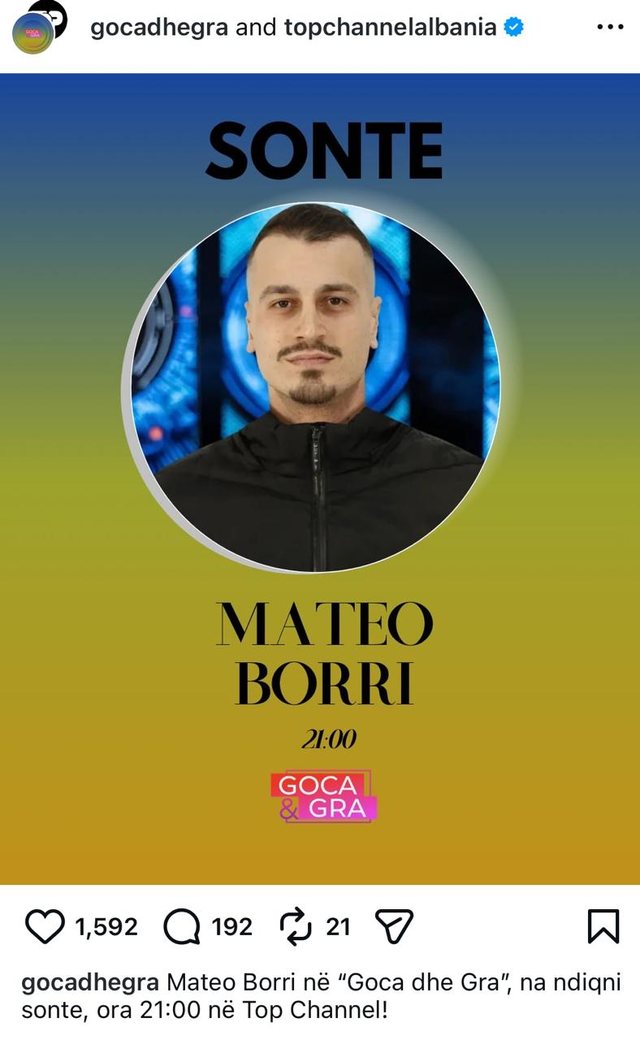 Ky lajm është konfirmuar nga vetë produksioni i këtij reality show, të cilët përmes një postimi të bërë në Instagram tregojnë se Mateo do të jetë i ftuar për një intervistë në emisionin “Goca dhe Gra”.