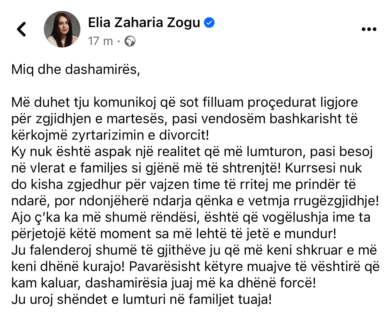 “Miq dhe dashamirës, Më duhet tju komunikoj që sot filluam proçedurat ligjore për zgjidhjen e martesës, pasi vendosëm bashkërisht të kërkojmë zyrtarizmin e divorcit! Ky nuk është aspak një realitet që më lumturon, pasi besoj në vlerat e familjes si gjënë më të shtrenjtë! Kurrsesi nuk do kisha zgjedhur për vajzen time të rritej me prindër të ndarë, por ndonjëherë ndarja qenka e vetmja rrugëzgjidhje!