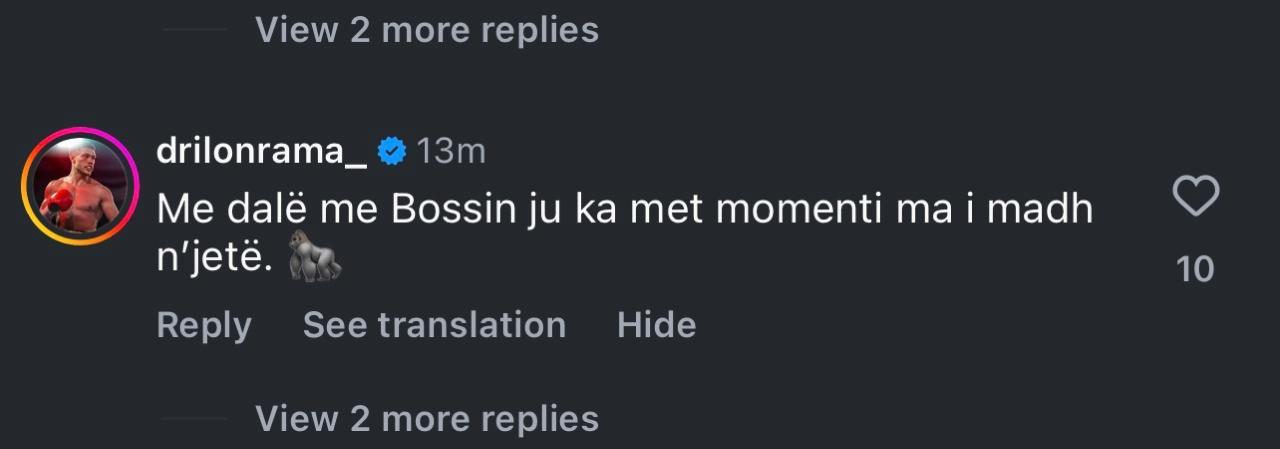 “Me dal me bossin ju ka met momenti ma i madh në jetë,” ka shkruar Driloni, duke i lënë të gjithë të mendojnë se kujt ia dërgoi në të vërtetë këtë mesazh.