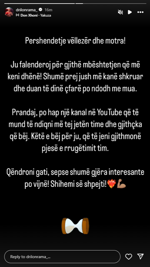 Përmes një postimi në Instastory, fituesi i BBVK-së, thotë se këtë gjë po e bën për fansat në mënyrë që ata të jenë pjesë e rrugëtimit të tij.