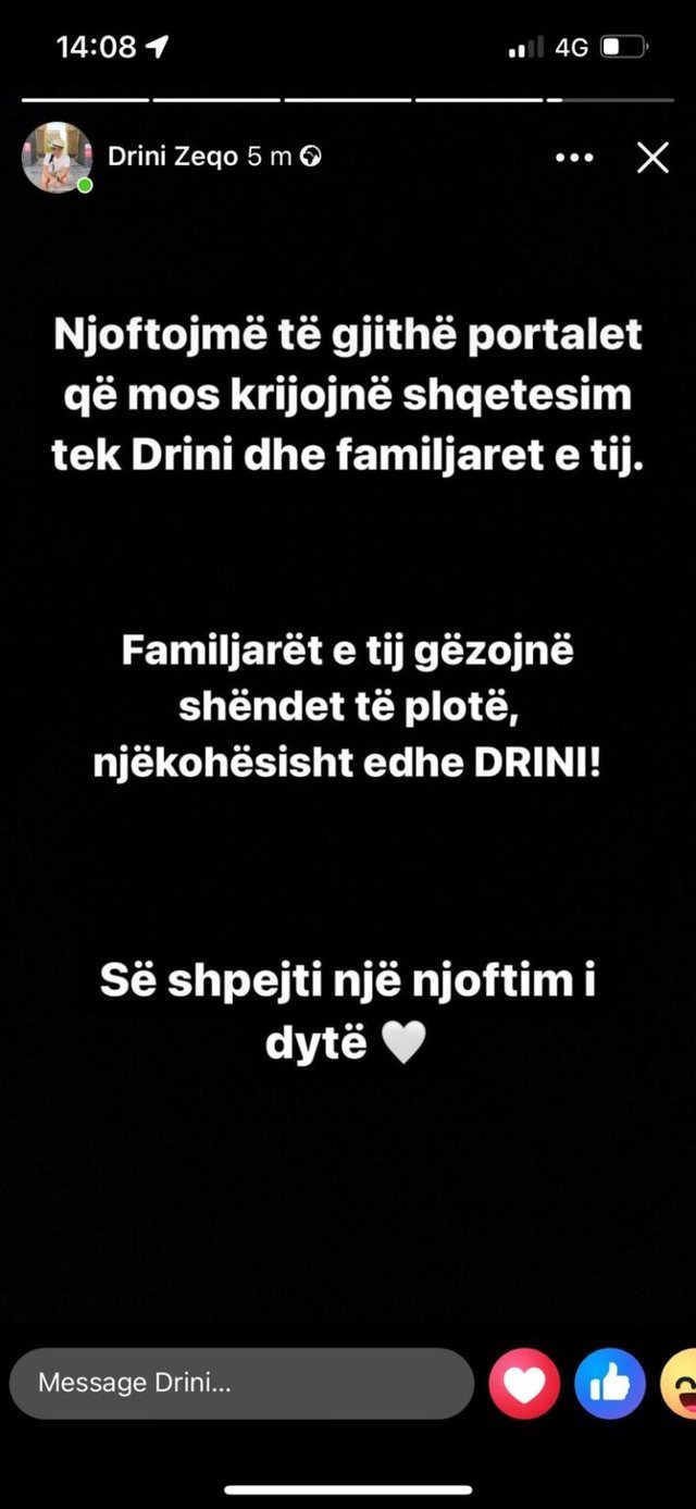 Ndërkohë, në një reagim në rrjete sociale, personi që menaxhon faqet e tij shkruan se familajrët e Drinit gëzojnë shëndet të plotë duke ngritur dyshime mbi largimin e tij të papritur. Ata paralajmërojnë se së shpejti do tregojnë arsyen e këtij vendimi.