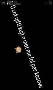 Fituesi i BBVK1 dhe reperi Stresi ka reaguar në instastory ku shkruan: