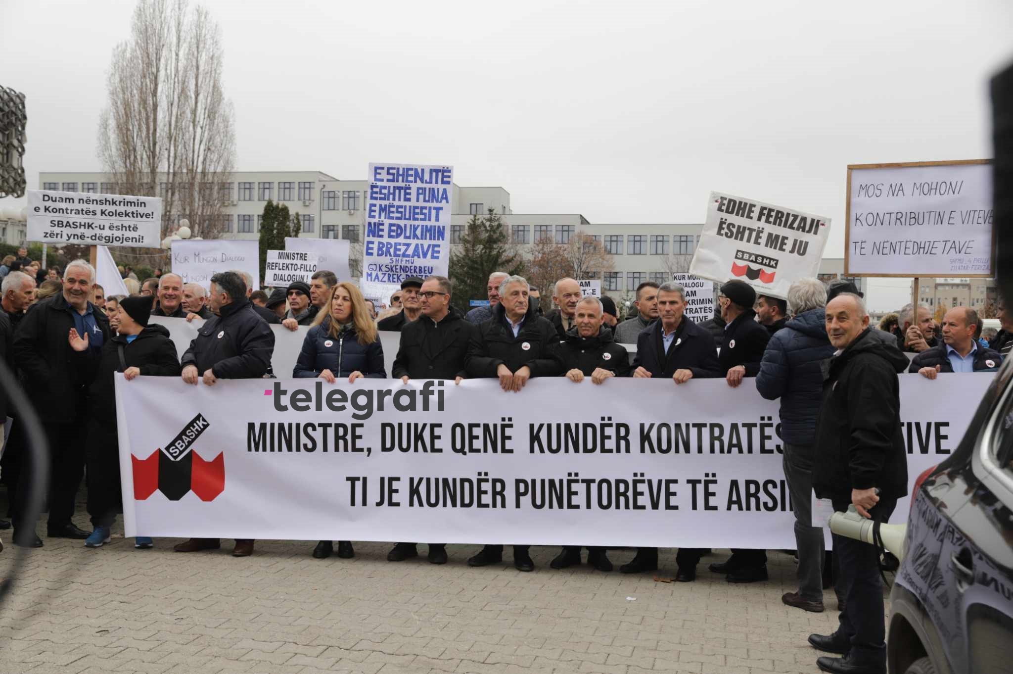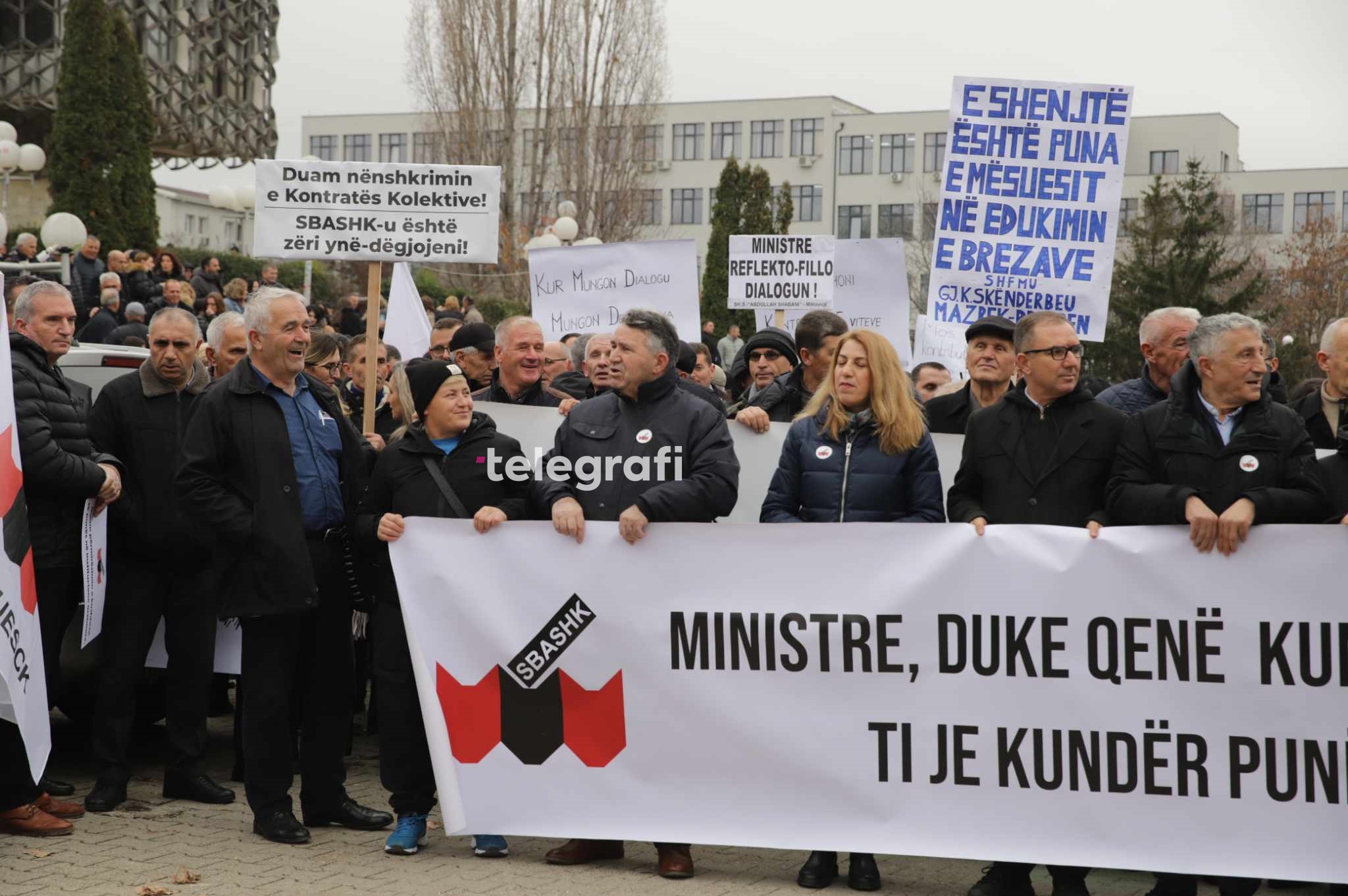 Punëtorët e Arsimit po mbajnë pankarta “Ministre, duke qenë kundër Kontratës Kolektive, je kundër punëtorëve të arsimit”, “E shenjë është puna e mësuesit në edukimin e brezave”, “Qeveria realizo kërkesat tona, parandalo veprimet tjera sindikale”, etj.