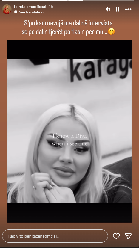 Por, duket se kjo deklaratë nuk ka kaluar pa rënë në syrin e vetë Benitës. Orë pas kësaj interviste, ajo ka publikuar një ‘InstaStory’, e cila është interpretuar menjëherë si një thumb i drejtpërdrejtë ndaj deklaratave të Klodit.