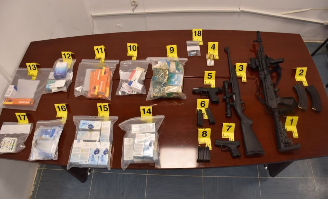 Në njoftimin e policisë bëhet e ditur se janë kontrolluar pronat e tij, ku janë konfiskuar armë e medikamente.