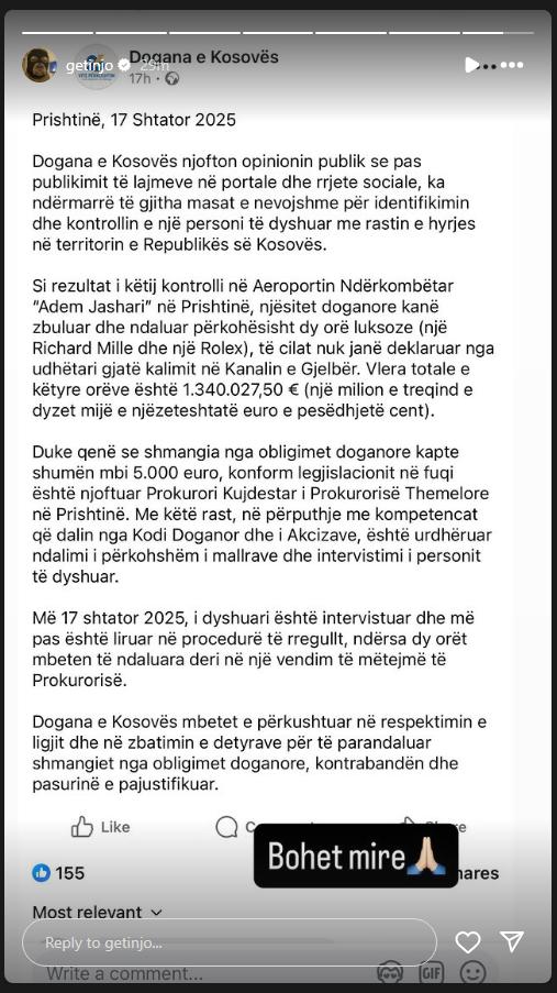 “Dogana e Kosovës njofton opinionin publik se pas publikimit të lajmeve në portale dhe rrjete sociale, ka ndërmarrë të gjitha masat e nevojshme për identifikimin dhe kontrollin e një personi të dyshuar me rastin e hyrjes në territorin e Republikës së Kosovës.