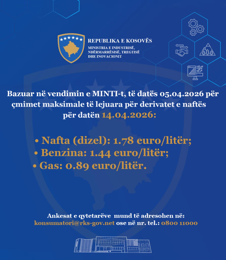 Sipas vendimit të ministrisë për datat 12 dhe 13 prill, një litër naftë ka kushtuar 1.84 euro, kurse benzina 1.44 euro litri. Çmimi i gasit për këto dy ditë ka qenë 0.89 euro litri. /teve1.info/