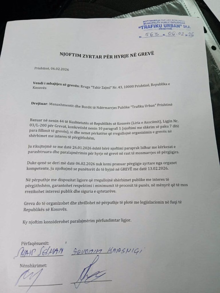 Punëtorët e ndërmarrjes publike “Trafiku Urban” në Prishtinë kanë paralajmëruar nisjen e një greve që do të fillojë më 13 shkurt 2026, në mungesë të përgjigjes zyrtare ndaj kërkesave të tyre.