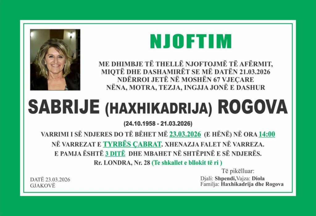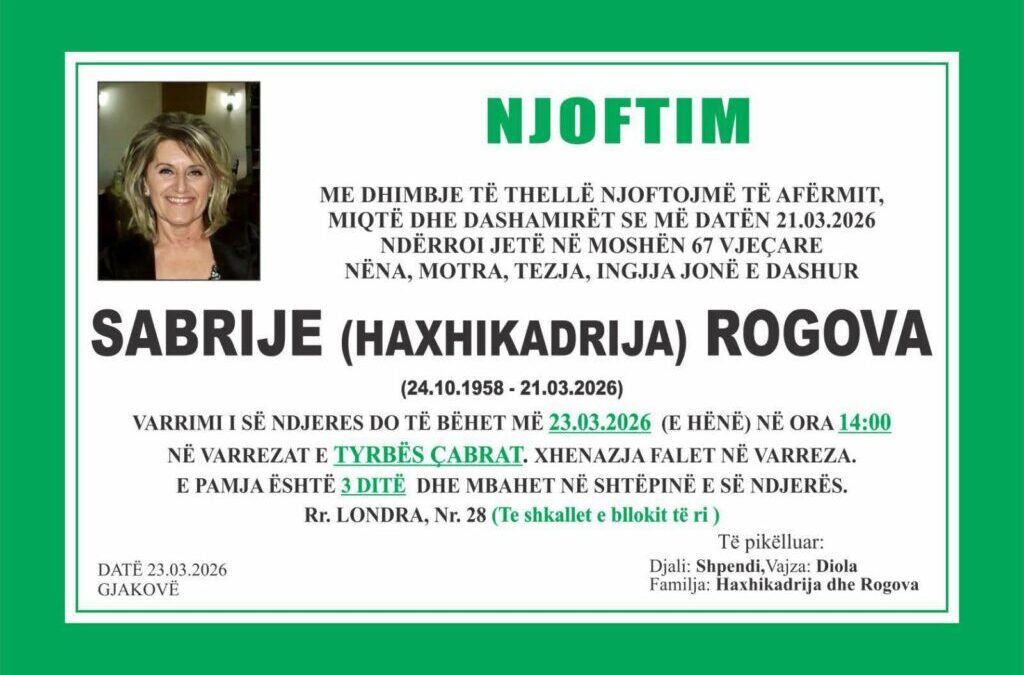 Familjarët kanë bërë të ditur se varrimi i së ndjerës do të bëhet në orën 14:00, në varrezat e Tyrbja e Çabratit.