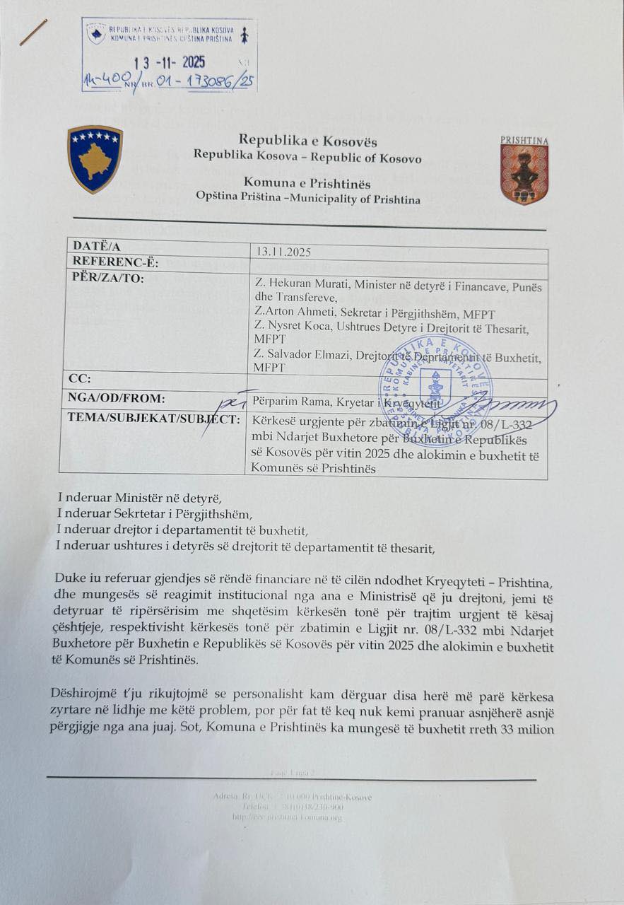 Kryetari i Prishtinës, Përparim Rama, i është drejtuar me një shkresë ministrit në detyrë të Financave, Hekuran Murati, për zhbllokimin e buxhetit për Prishtinë, duke thënë se kryeqyteti është në gjendje të rëndë financiare.