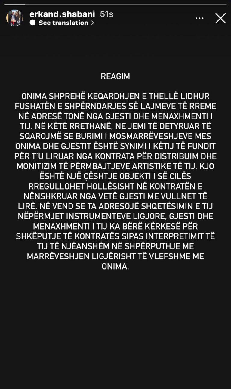 Në reagim theksohet se sipas Onimës, burimi i mosmarrëveshjeve është dëshira e Gjestit për t’u liruar nga kontrata për shpërndarjen dhe monetizimin e përmbajtjeve të tij artistike — çështje që, siç thuhet, është e përcaktuar në kontratën e nënshkruar me vullnet të lirë nga vetë artisti.