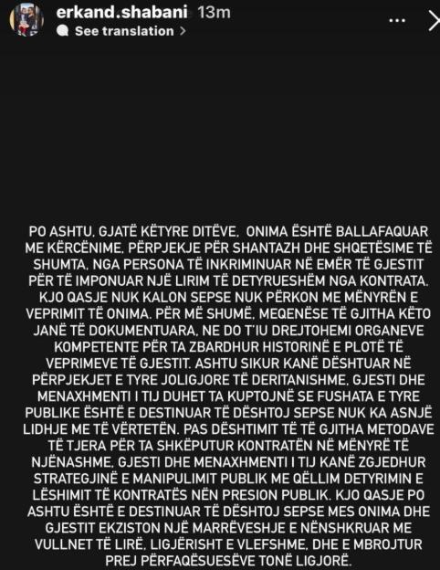 Në një reagim të dytë, Onima shton se gjatë ditëve të fundit është përballur “me kërcënime, përpjekje për shantazh dhe shqetësime të shumta nga persona të inkriminuar në emër të Gjestit” me qëllim, sipas tyre, detyrimin për të liruar artistin nga kontrata. Shabani thekson se të gjitha këto veprime janë të dokumentuara dhe se kompania do t’u drejtohet organeve kompetente për zbardhjen e plotë të historisë.