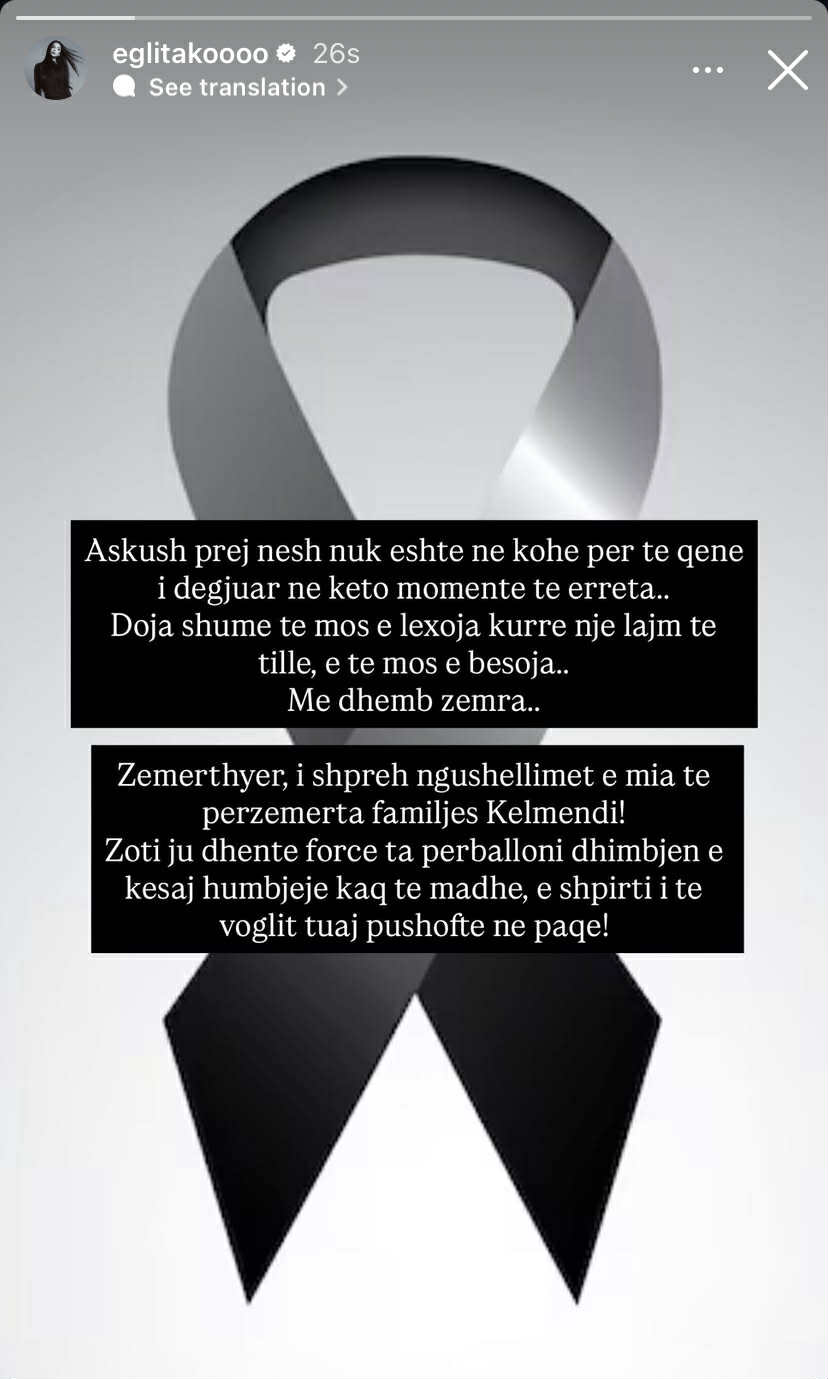 “Askush prej nesh nuk është në kohë për të qenë i dëgjuar në këto momente të errta. Doja shumë të mos e lexoja kurrë një lajm të tillë, e te mos besoja me dhemb zemra. Zemërthyer, i shpreh ngushëllimet e mia të përzermta familjes Kelemndi, Zoti ju dhente forcë te përballoni dhimbjen e kësaj humbje kaq të madhe, e shpirti i te voglit tuaj pushoftë në paqe” u shpreh ajo.