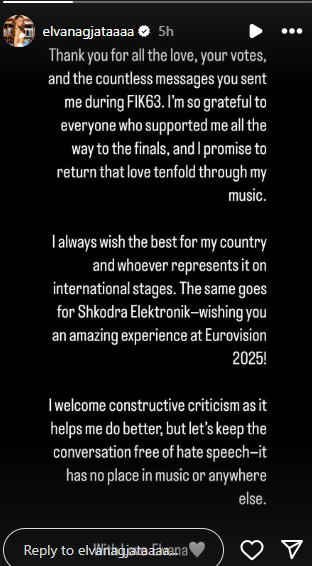 Unë e mirëpres kritikën konstruktive pasi më ndihmon të bëj më mirë, por le ta mbajmë bisedën pa gjuhën e urrejtjes – ajo nuk ka vend në muzikë apo askund tjetër. Me dashuri Elvana”.
