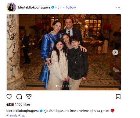 Me këtë postim, Blerta ka treguar edhe një herë se për të, familja është vlera më e lartë dhe më e shtrenjtë në jetë. Fotografia ka marrë dhjetëra pëlqime dhe komente pozitive, ndërsa ndjekësit e kanë vlerësuar për thjeshtësinë dhe dashurinë që reflekton në çdo dalje publike.