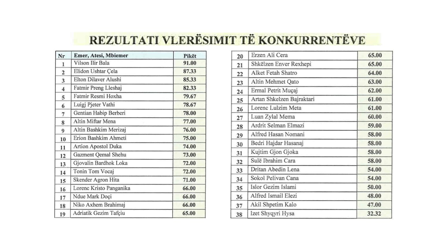 “Komisioni i Vlerësimit të Aplikimeve për përzgjedhjen e kandidatëve për drejtor të drejtorisë vendore në Policinë e Shtetit, i përbërë nga 3 drejtues të lartë të Policisë së Shtetit, pas shqyrtimit të dokumentacionit dhe intervistës së kandidatëve të cilët kanë aplikuar për pozicionin “Drejtor i Drejtorisë Vendore” në Policinë e Shtetit, vendosi të shpallë listën e pikëve të fituara nga secili kandidat gjatë procesit të konkurrimit.