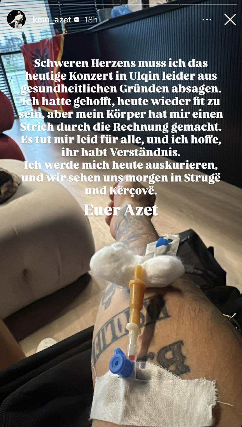 Reperi shqiptar Azet ka njoftuar ndjekësit e tij përmes një postimi në rrjete sociale se nuk do të mund të performojë në koncertin e planifikuar në Ulqin, për shkak të gjendjes së tij shëndetësore.