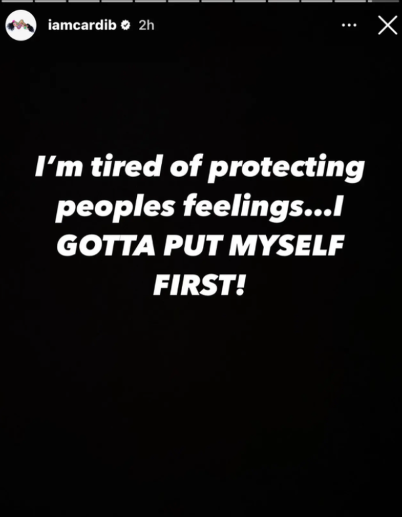 Cardi publikoi në Instastory disa mesazhe, të cilat u interpretuan si kunja për Offset. Ndër të tjera, reperja shkroi: “Jam e lodhur duke mbrojtur ndjenjat e të tjerëve…Duhet të vendos veten të parën”.