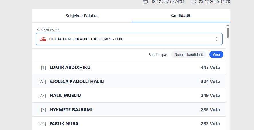 Deri në këto momente, sipas rezultateve të përditësuara nga KQZ, kandidatët nga Lëvizja Vetëvendosje po prinë për nga numri i votave të marra.